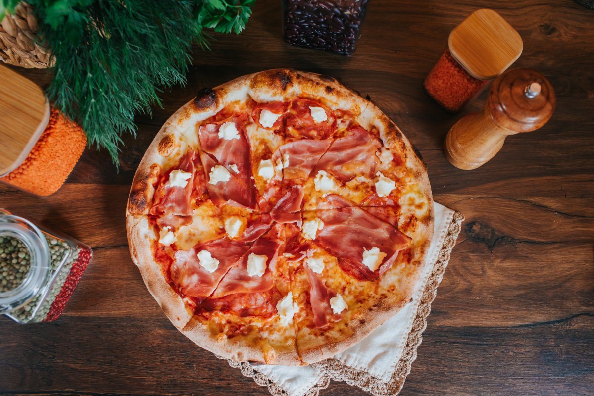 Ingrediente: faina pentru pizza, maia, reteta autentica a Atelierului, ulei de masline extra virgin, sos de rosii, mozzarella, salam spianata picanta, bacon, branza Philadelphia
