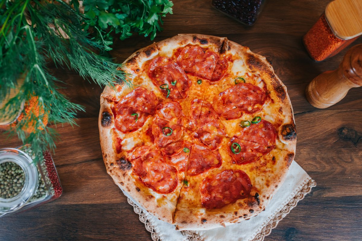 Ingrediente: faina pentru pizza, maia, reteta autentica a Atelierului, ulei de masline extra virgin, sos de rosii, mozzarella, salam spianata picanta, ardei iute