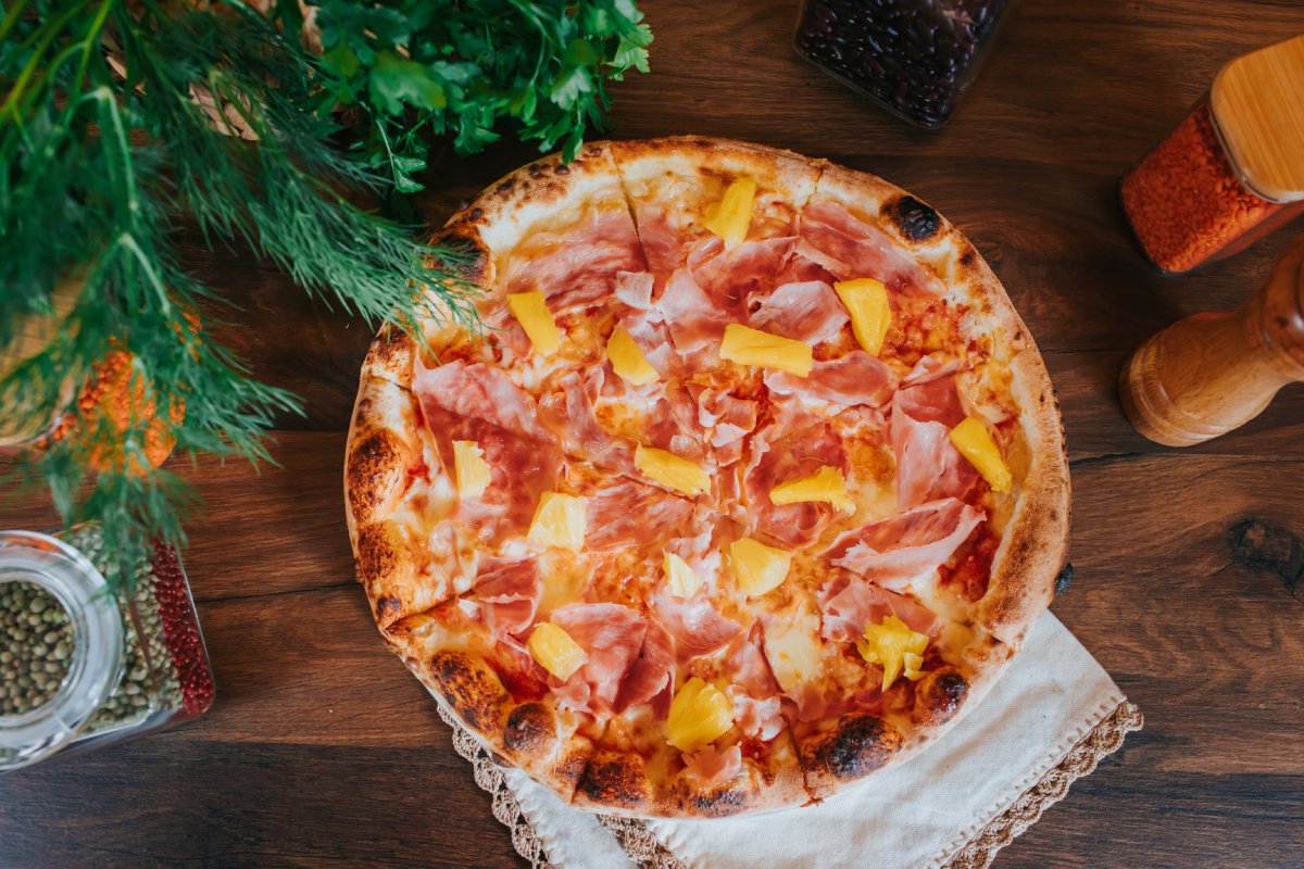 Ingrediente: faina pentru pizza, maia, reteta autentica a Atelierului, ulei de masline extra virgin, sos de rosii, mozzarella, prosciutto, compot ananas