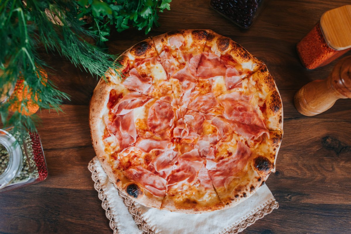 Ingrediente: faina pentru pizza, maia, reteta autentica a Atelierului, ulei de masline extra virgin, sos de rosii, mozzarella, prosciutto