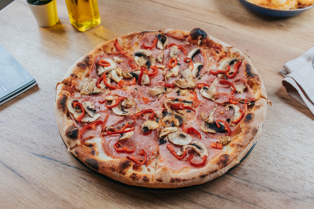 Ingrediente: faina pentru pizza, maia, reteta autentica a Atelierului, ulei de masline extra virgin, sos de rosii, mozzarella, prosciutto, salam napoli dolce, ciuperci champignon, ardei kapia